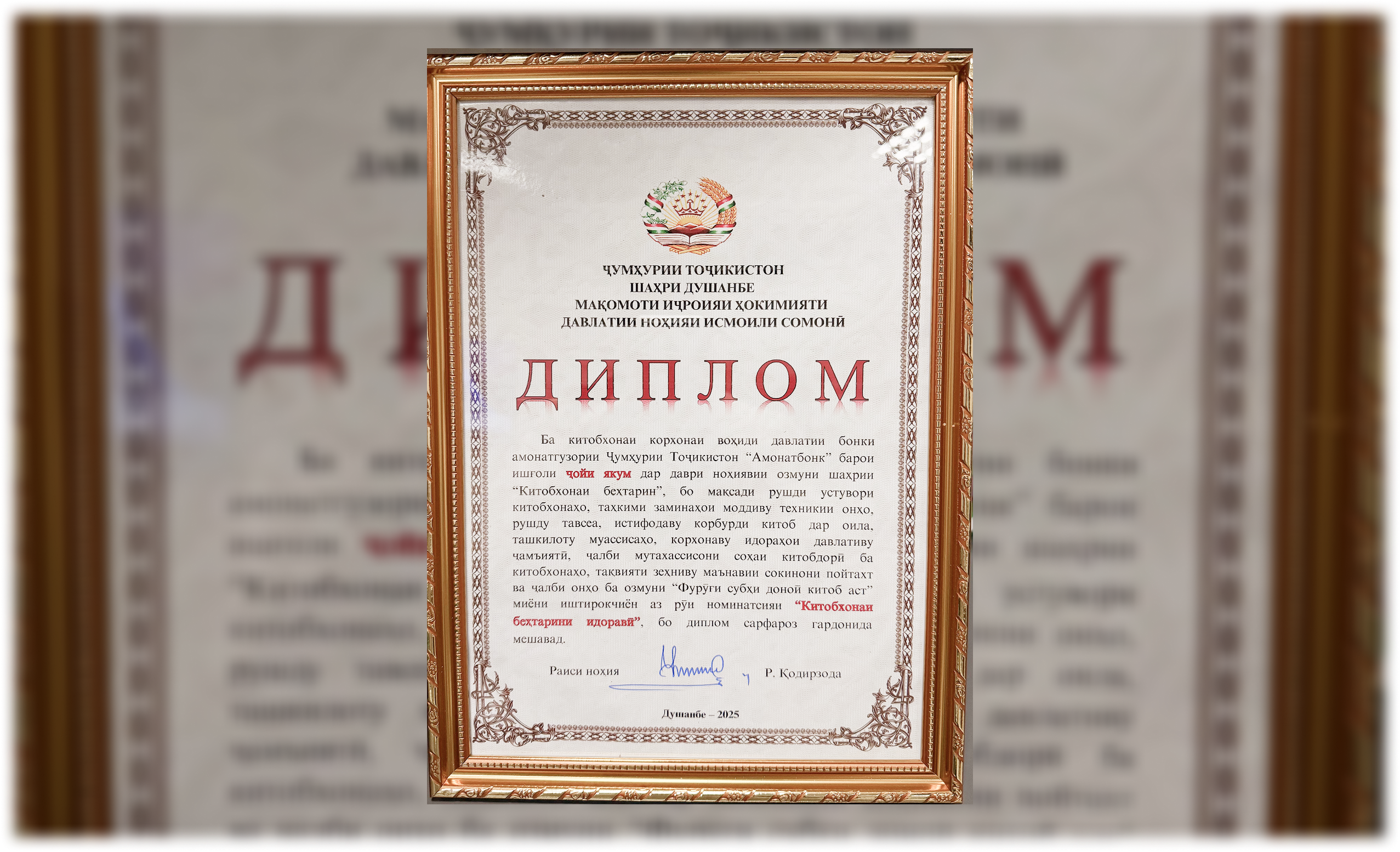 Бо мақсади рушди усутувори китобхонаҳо, таҳкими заминаҳои моддиву техникии онҳо, рушду тавсеа, истифодаву корбурди китоб дар оила, ташкилоту муассисаҳо, корхонаву идораҳои давлативу ҷамъиятӣ, ҷалби мутахассисони соҳаи китобдорӣ ба китобхонаҳо, тақвияти зеҳниву маънавии сокинони пойтахт ва ҷалби онҳо ба озмуни “Фурӯғи субҳи доноӣ китоб аст” аз ҷониби МИҲД ноҳияи Исмоили Сомонии шаҳри Душанбе, Амонатбонк дар вазъияти тантанавӣ бо Диплом сарфароз гардонида шуд.